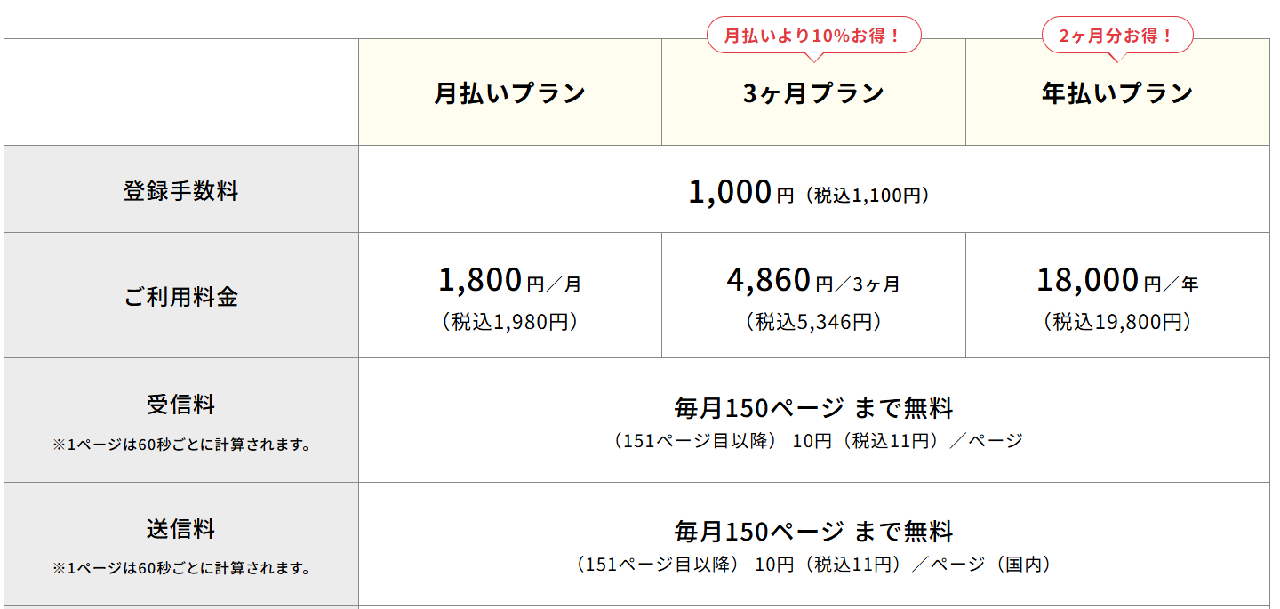 受信単価 | 0円 (~150頁/月) 11円 (151頁~/月) | 0円 (~150頁/月) 11円 (151頁~/月) | (~1,000頁/月) 11円 (1,001~頁/月) | 0円ー | 3円 | 0円 | 0円(~100頁/月) 11円(101頁~/月) |