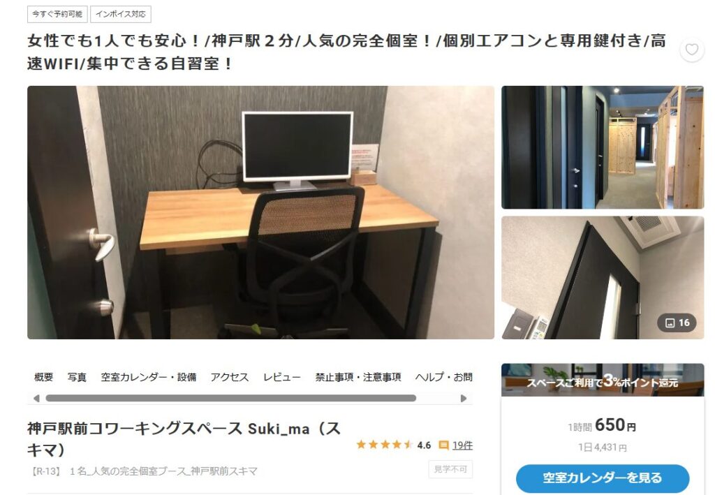 <利用満足度> ★★★★☆(4/5点) <サイズ・静けさ・空調の快適さ> 個室は一人で仕事をするには十分なスペースがありました。周囲の音は多少聞こえますが、何を話しているかまでは聞こえないので、さほど気にならずになれたら、仕事に集中できる程度のものでした。 ただ、夏に利用しましたが冷房が少し効きすぎているような気がしました。 <電源・Wi-Fi・備品> お値段の割にはしっかりしていて、Wi-Fiもあるので、仕事をするには十分だったと思います。 Wi-Fiのスピードも問題ありませんでした。この値段でこの装備であれば十二分かと思います。 <机・椅子> しっかり事前に見ておかなかったこともあって、机と椅子のセットと思いこんでいたら、まさかの直座りで座椅子だったので驚きました。 長時間の作業には不向きかもしれません。あと、座椅子の背もたれが動かなくて使い物にならなかったのが残念でした。 <飲食持ち込み> 可能 <利用者の感想(メリット・デメリット)> 神戸のど真ん中でアクセスが非常に良い割に、値段が非常に安いので、そこが最大のメリットかなと思います。 この立地でこの値段であれば、座椅子でも良いかなと思わせるほどの価値がありました。 あと、自分的にはしっかり個室になっていて、施錠できるというところの安心感も大きいと思います。。