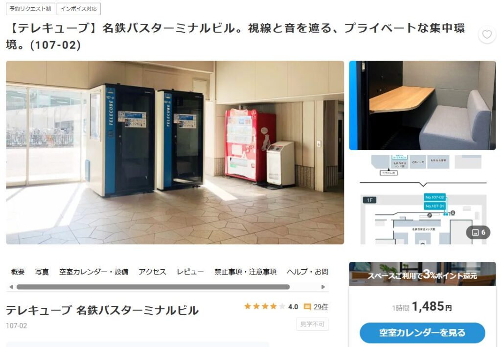 初めて借りました。バスターミナルと言うロケーションでしたが平日の夕方と言う時間帯でも周囲の音も気にせず利用出来たのは良かったです。空調は時期的に初夏で良かったのですが名古屋の真夏40度に耐えられるかが疑問でした。